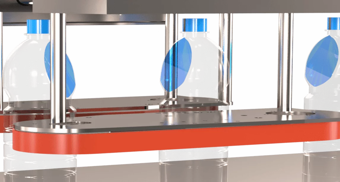 Un système d’orientation construit pour les bouteilles de formes. La détection par caméra associée à un logiciel, définit la bonne position de la bouteille. Le logiciel calcule l’angle de correction nécessaire pour obtenir la bonne orientation. Les courroies reçoivent l’information et corrigent l’angle de la bouteille.